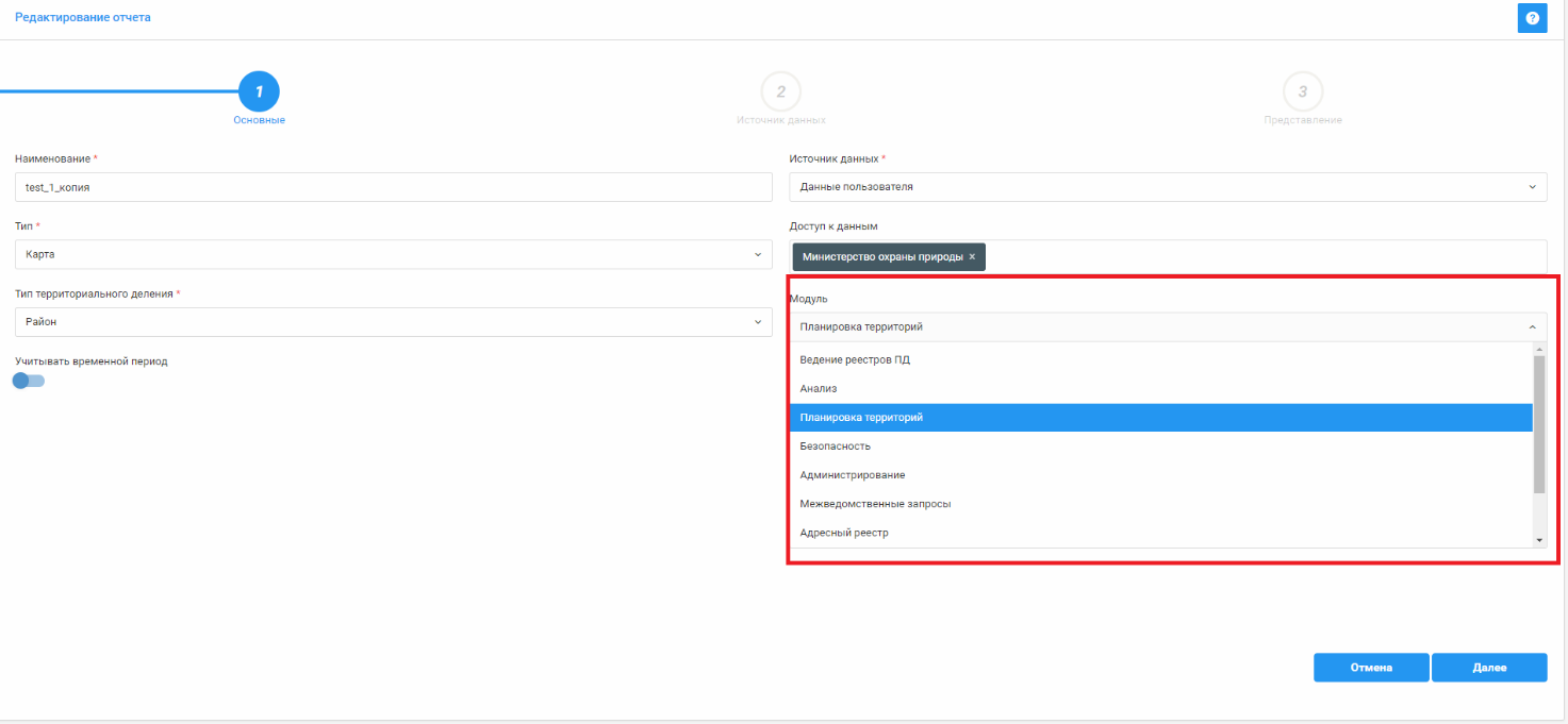 7.Модуль - Чтобы отчет был доступен в разделе «Отчеты» определенного модуля при укажите его в «Основных настройках» создаваемого/созданного отчета